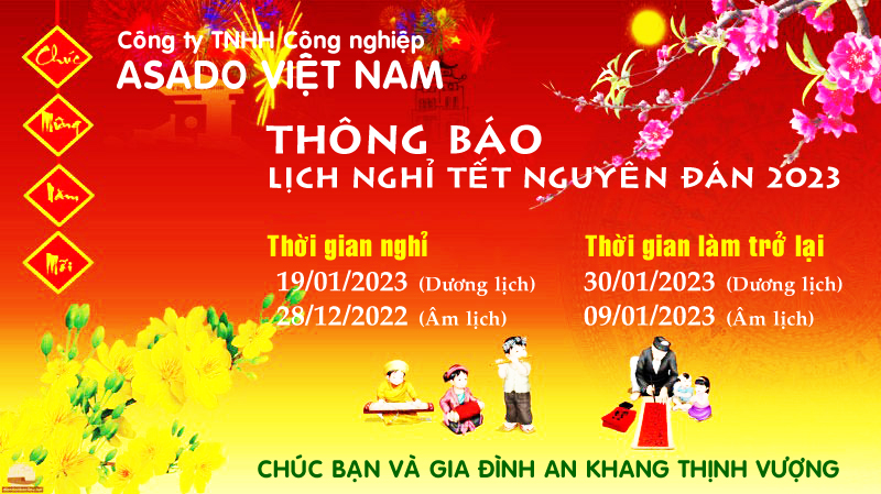 🏵 Công ty TNHH Công nghiệp Asado Việt Nam xin trân trọng gửi tới Quý khách hàng và đối tác lịch nghỉ TẾT NGUYÊN ĐÁN 2023