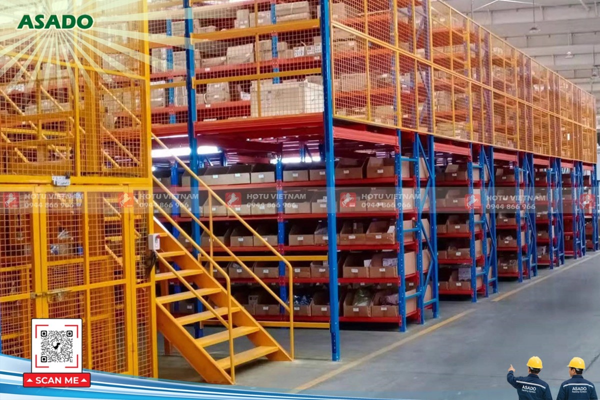 - Giúp tận dụng tối đa không gian chiều cao kho qua việc tạo thêm tầng sàn, thường dùng để lưu trữ hàng hóa nhiều chủng loại, kết hợp thêm việc bố trí văn phòng, khu vực đóng gói...
