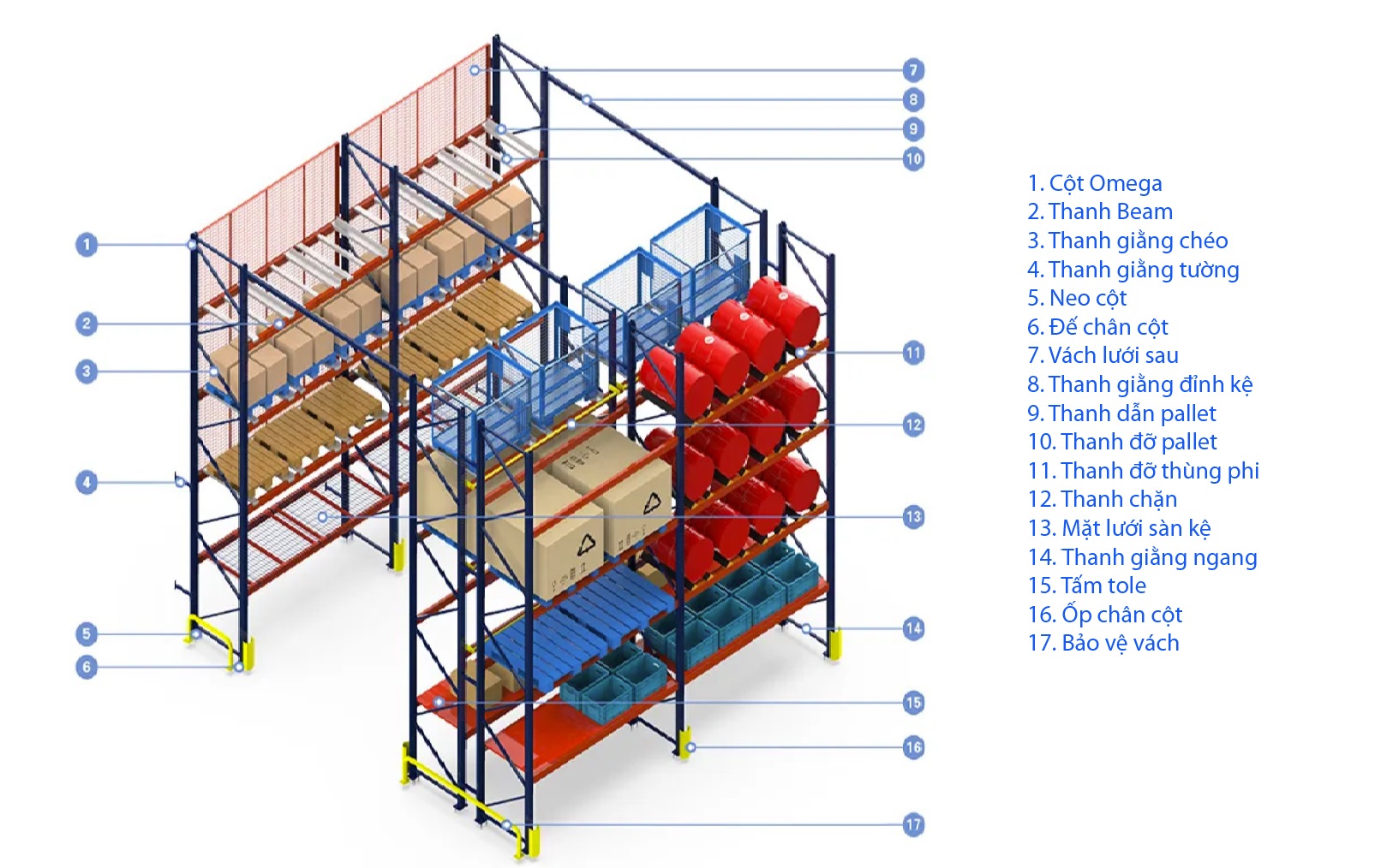 Cột bảo vệ và rào bảo vệ: Giúp bảo vệ hệ thống kệ khỏi những va chạm không mong muốn từ xe nâng hoặc các thiết bị khác trong kho.