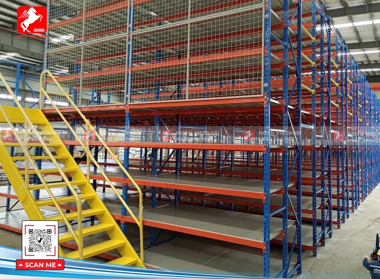 Giúp tận dụng tối đa không gian chiều cao kho qua việc tạo thêm tầng sàn, thường dùng để lưu trữ hàng hóa nhiều chủng loại, kết hợp thêm việc bố trí văn phòng, khu vực đóng gói...