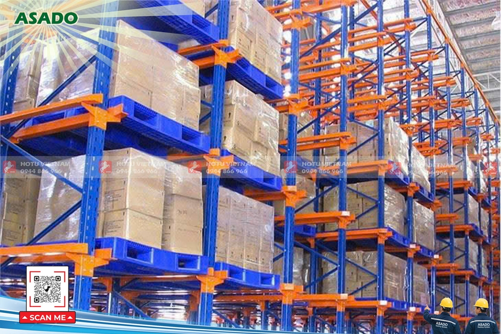 Lưu trữ 2 pallet nối tiếp nhau, tăng mật độ chứa hàng, qua đó giúp tiết kiệm diện tích lối đi, nâng cao khả năng lưu trữ 30–40%. tuy nhiên không linh hoạt bằng Kệ selective và yêu cầu xe nâng chuyên dụng cho kệ này