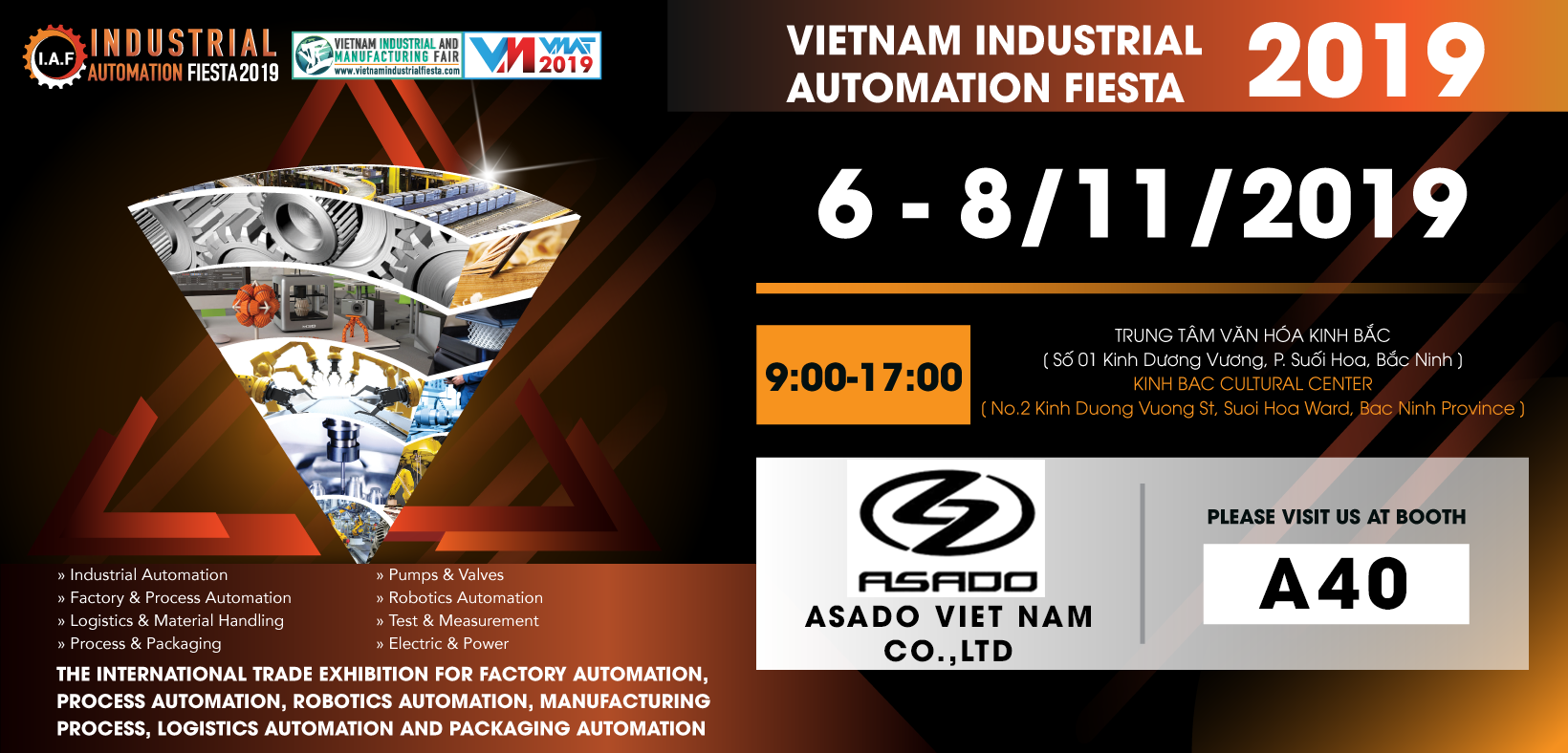 Công ty TNHH công nghiệp ASADO Việt Nam sẽ tham gia gian hàng trưng bày tại Triển Lãm Công Nghiệp & Sản Xuất Việt Nam 2019 [ Vietnam Industrial & Manufacturing Fair - VIMF] kết hợp với Triển Lãm Tự Động Hóa Công Nghiệp Việt Nam 2019 [ Vietnam Automation Fiesta - VIAF] tại Bắc Ninh từ ngày 06 đến ngày 08 tháng 11 năm 2019.