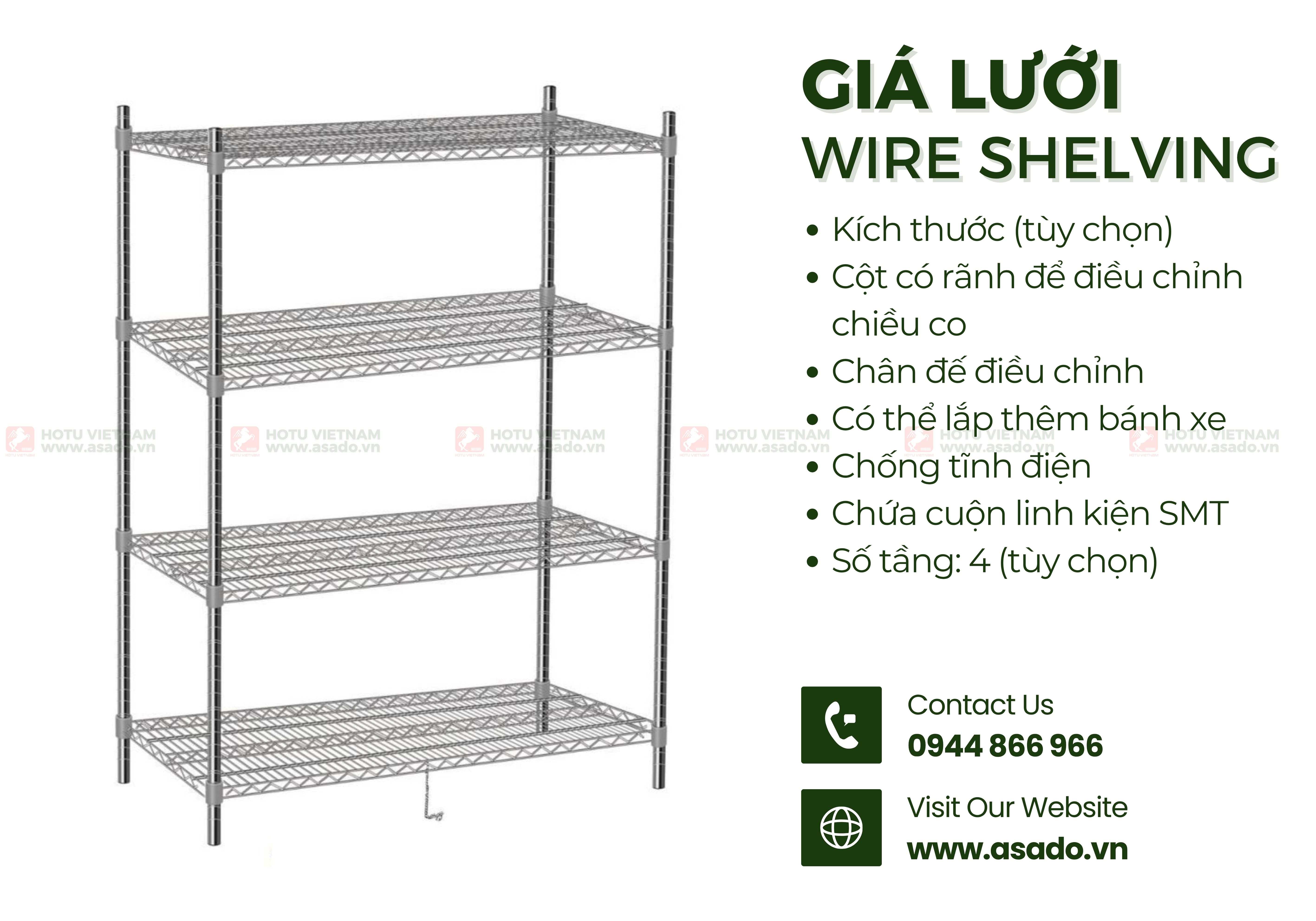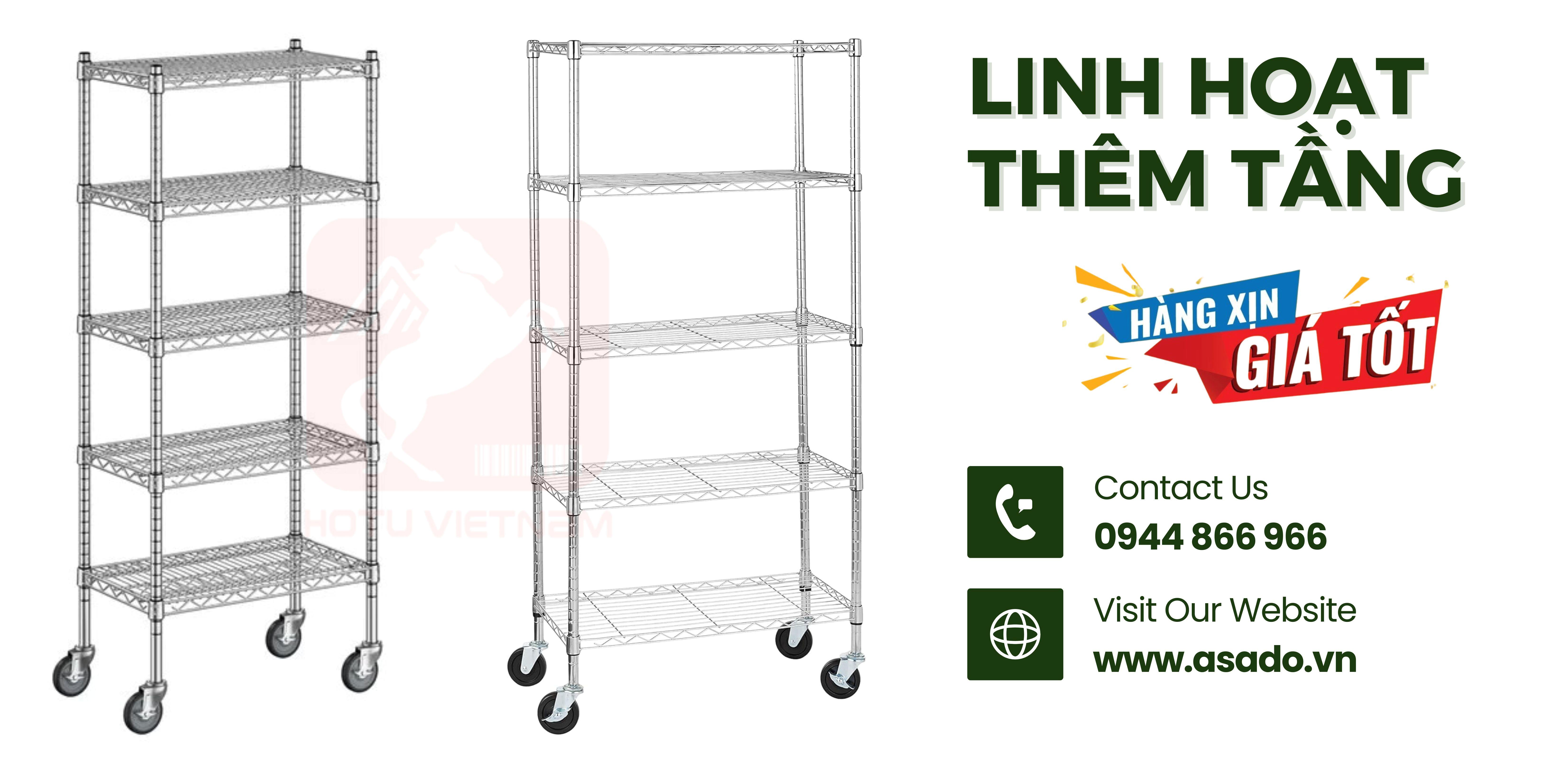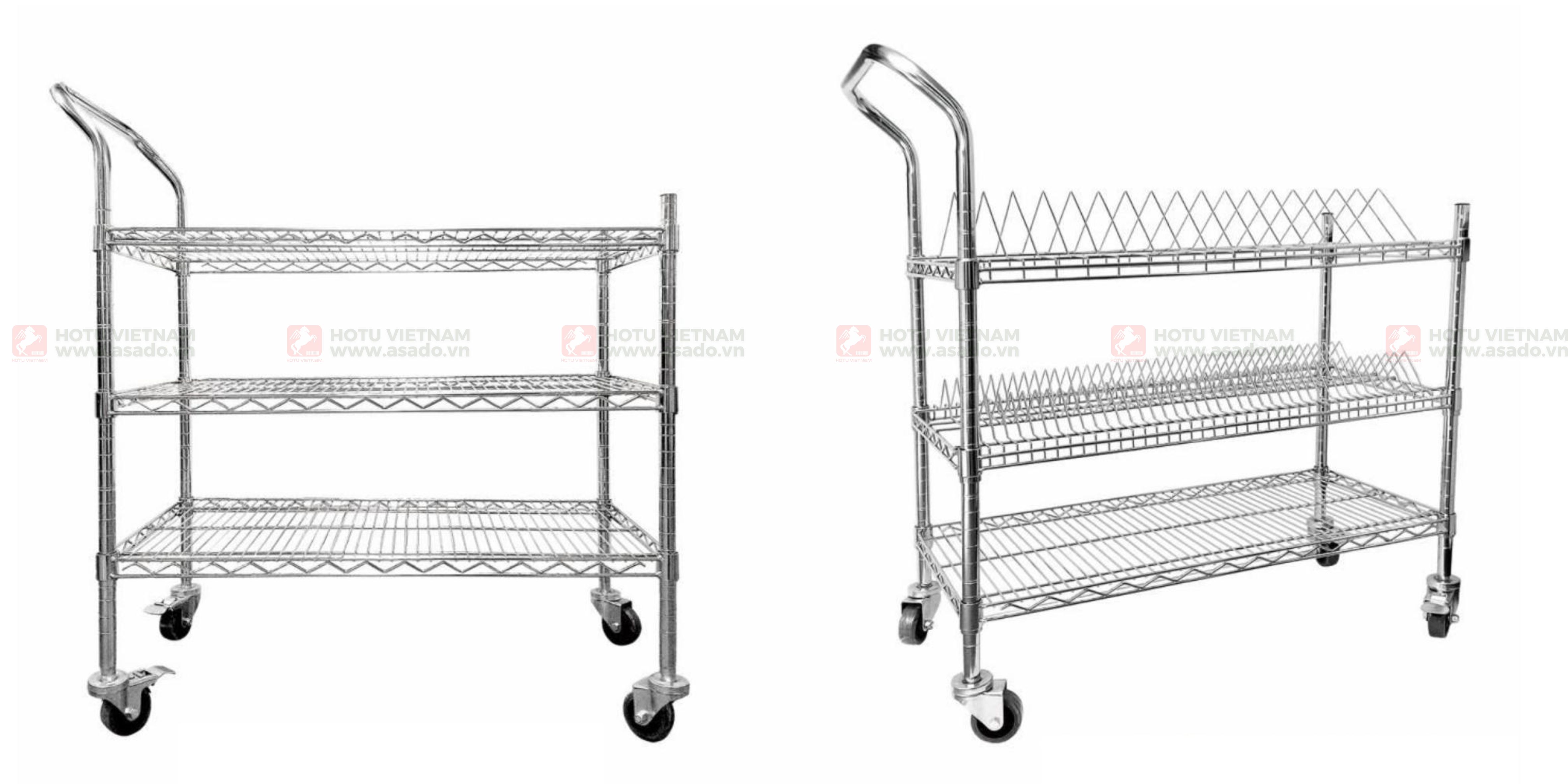 Là loại Xe đẩy được làm từ thép mạ crome hoặc inox, trong đó mặt xe đẩyđược cấu tạo bằng các thanh thép hàn đan dạng lưới (wire mesh). Các tầng xe đẩy được gắn vào 4 cột trụ (D25.4mm), có thể tăng giảm độ cao linh hoạt bằng ốp nhựa