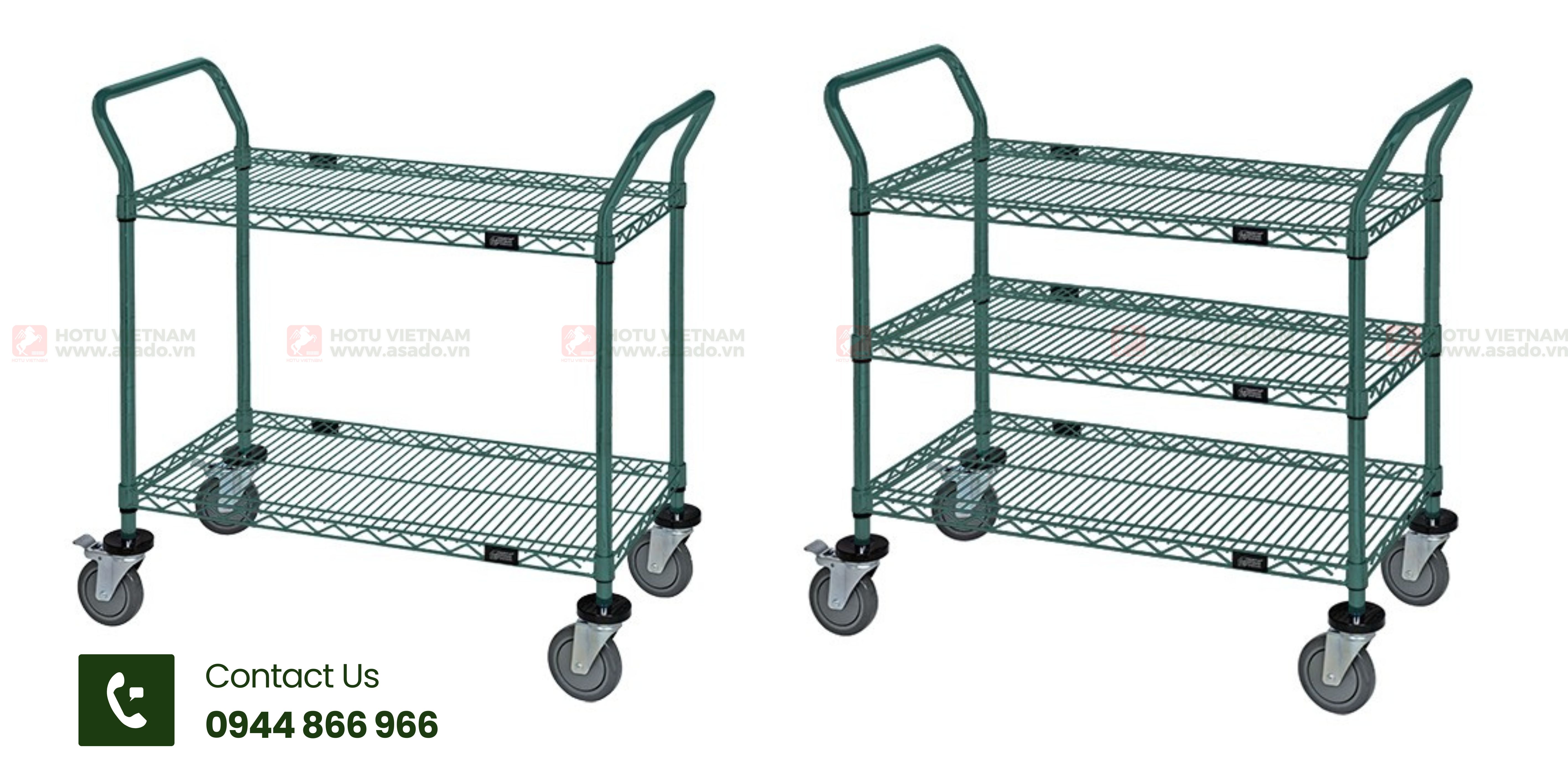 Do mặt xe đẩy là lưới, giúp không khí lưu thông, tránh đọng nước – phù hợp cho môi trường cần vệ sinh cao như kho lạnh, y tế, thực phẩm.